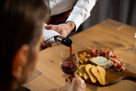 A man in a white shirt standing next to the wooden table, pouring guests a red wine from a bottle into a wine glass. Wine tasting with cheese board. Celebrating special occasions with friends, family