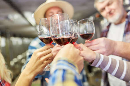 Winegrowers team celebrates or makes a wine tasting while toasting with red wine