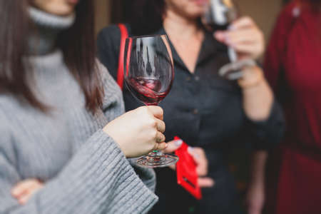 Glass of red wine in hand at a special event, a specific tasting of alcoholic beverages.