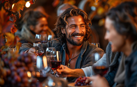 diverse group of friends toasting with red wine in a vineyard, happily celebrating at an autumn festival