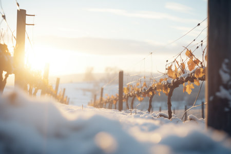 winter in the vineyard with snow blankets dormant vines and ambient light