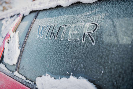 Parked car with snow on the windshield and the inscription Winter