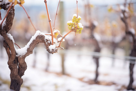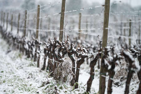 snow-dusted grapevines in winter