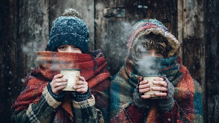 Two young friends bundled in hats, scarves and blankets stand in gentle snowfall by a rustic wooden wall, sharing steaming cups and warming hands in cozy winter togetherness