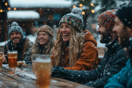 Group of friends in warm winter clothing enjoying beer at a snow covered outdoor bar