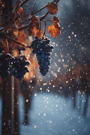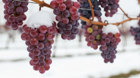 Beautiful close-up of frosted black grapes hanging from a vine, highlighting the cold winter environment. The scene captures nature's serene beauty and the uniqueness of seasonal growth.