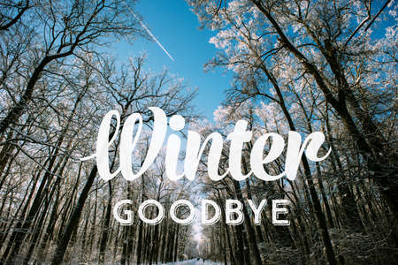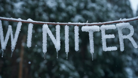 Frozen letters spelling WINTER are suspended from a snow-dusted branch, with icicles dripping below, set against a blurred winter forest backdrop.