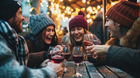 Group of friends toasting with red wine at a Christmas market.