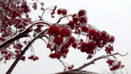 Frozen mountain ash. Ice-covered rowan berries
