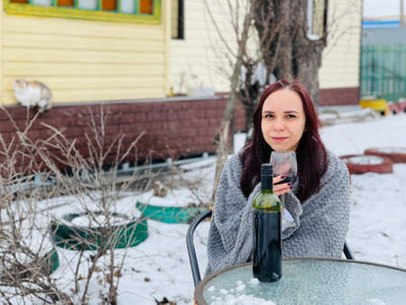 Young woman sitting in yard and drinking red wine in snowy weather. Female wrapped in gray plaid sitting on street with alcohol in winter season