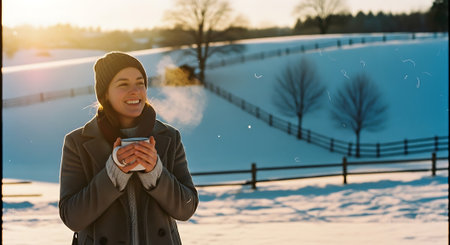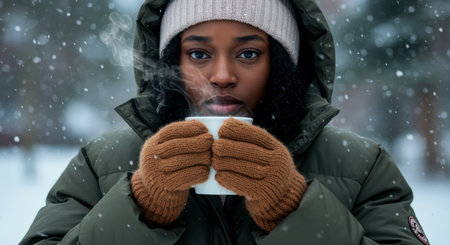 Young woman in warm winter coat and gloves holding steaming mug outdoors during snowfall, enjoying hot drink in cold weather.