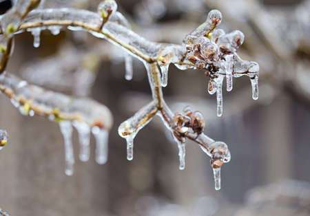 Branches of bush covered with ice after rain in frost in winter close-up. Frozen plants. After icy rain. Freezing rain. frozen raindrops, cold, ice, icy, frosty. Natural phenomenon. Natural background
