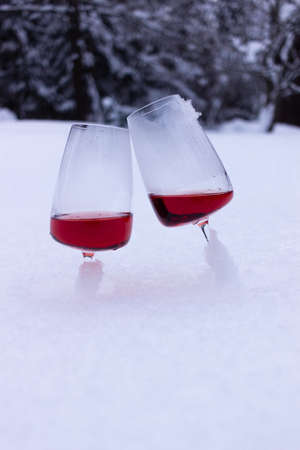Two glasses of red wine on a snowy background. Winter landscape.