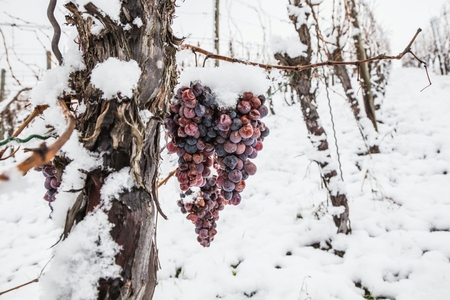 Ice wine. Wine red grapes for ice wine in winter condition and snow.
