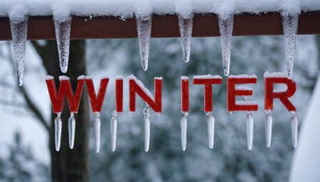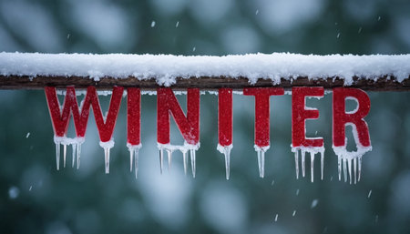 Bright red letters spelling WINTER are adorned with ice and dripping icicles, hanging from a snow-covered beam in a cold, atmospheric outdoor setting.