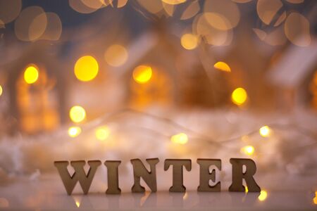 Word Winter on the snow surrounded by fir tree twigs and lights at night. Christmas and New Year seasonal theme.