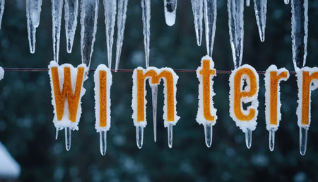 Orange letters spelling WINTER are encased in ice and adorned with dripping icicles, creating a striking visual.