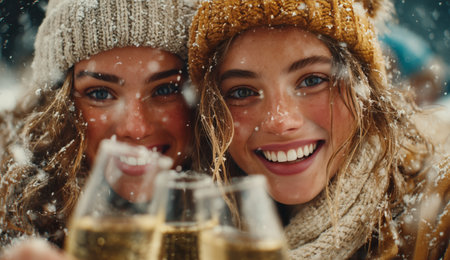 Two young women toast with glasses of champagne while smiling joyfully. They are bundled in cozy winter clothing, surrounded by falling snowflakes in a festive atmosphere.