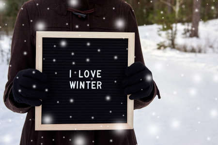 A frame with the inscription I love winter in the hands of a woman in gloves in nature.