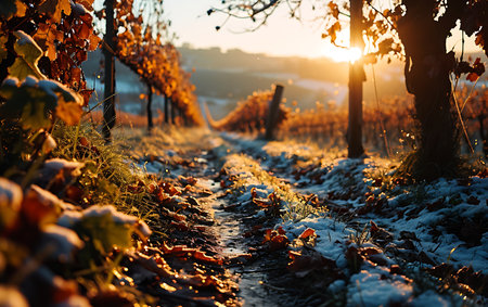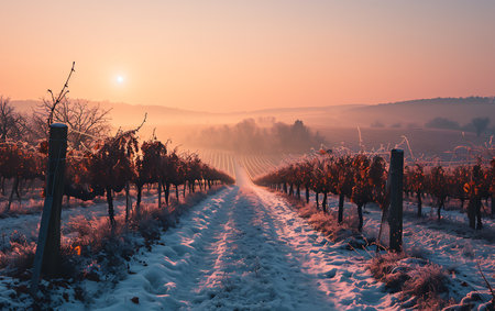 Chilly sunrise over vineyard illuminating the ice wine refinement process