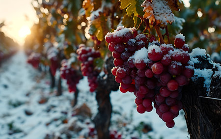 Frost-kissed vines glisten during icy night wine harvest
