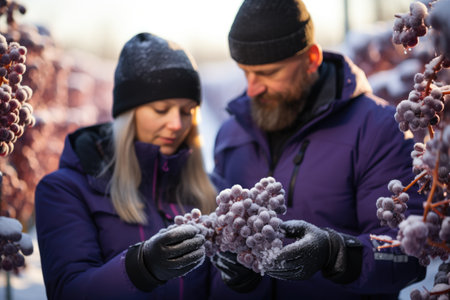 Grape selectors carefully inspecting frozen bunches for exquisite ice wine production