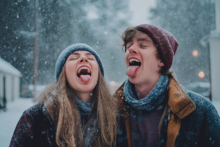 Happy couple catching snowflakes on their tongues, joyfully embracing the magic of a snowy day outdoors in a winter wonderland