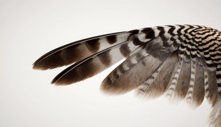 Delicate feathers from a bird wing exhibit beautiful, intricate designs of black and white. Soft lighting highlights the textures, creating a serene and elegant display of nature's artistry.