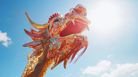 Colorful Traditional Dragon Under Bright Blue Sky Capturing Chinese New Year Celebration and Cultural Heritage.