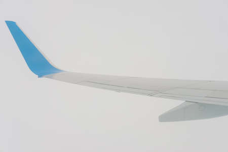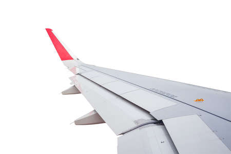 Wing of airplane flying on white background
