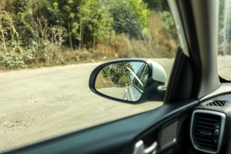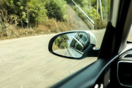 View from side mirror in car. Summer landscape in sideview mirror of road and cars driving in distance against blue