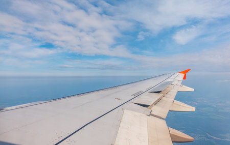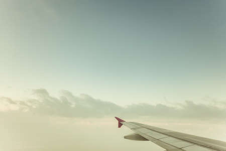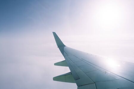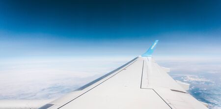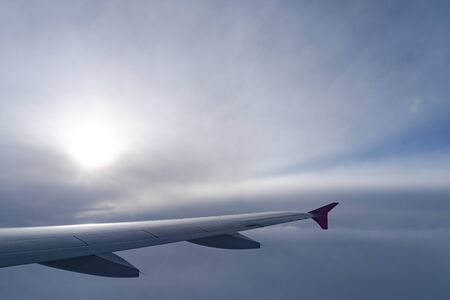 Adventure, travel, transport concept. View from plane window at sky with clouds and wing