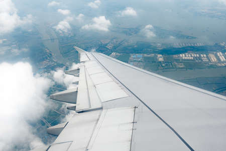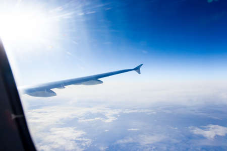 View from the airplane window at a beautiful cloudy sky and the airplane wing. Earth and sky as seen through window of an airplane.
