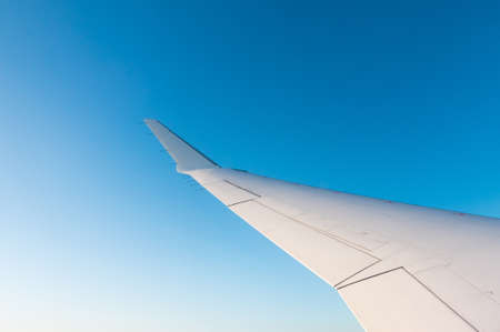 View from airplane window. Airplane wing in the blue sky above the clouds.