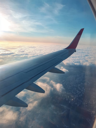 This stunning view showcases a morning flight with a planes wing above fluffy clouds, illuminated by vivid sunlight that brightens the sky and the city below, creating an enchanting atmosphere