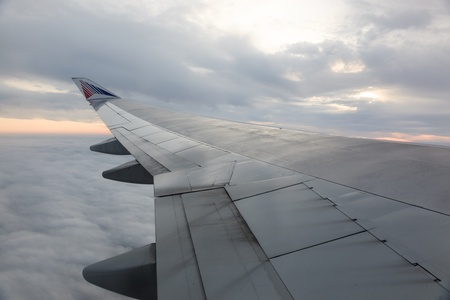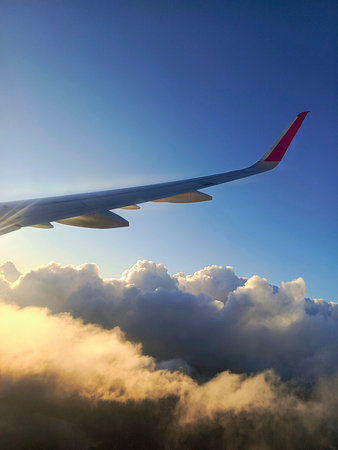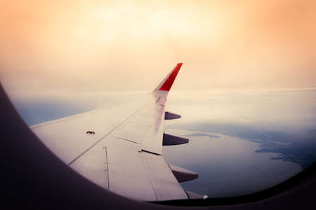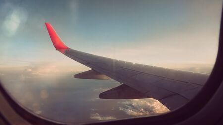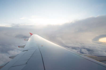 Flying and traveling, view from airplane window on the wing on cloudy sunset afternoon