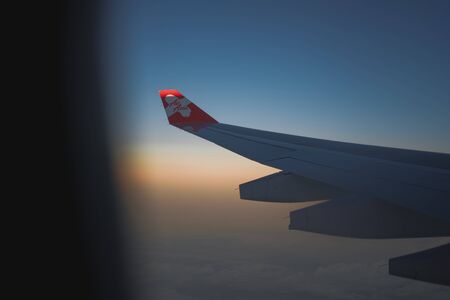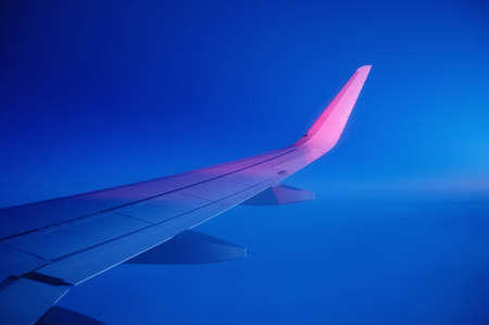Up in the air, view of aircraft wing silhouette in dark blue sky horizon and cloud background in sun rise time. from viewed airplane window