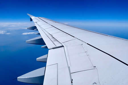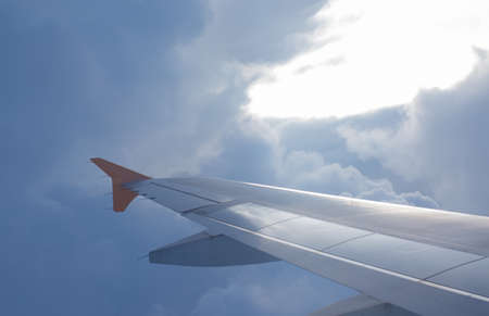 Wing of an airplane flying above the clouds. Airplane in the sky.
