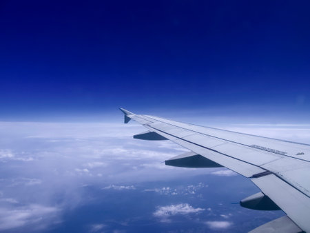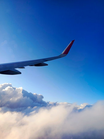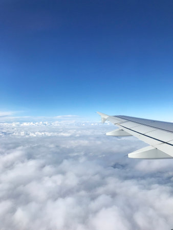 Clear blue sky, fluffy ornamental cumulus clouds. Panoramic view from an airplane, wing close-up. Dreamlike cloudscape. Travel, tourism, freedom, peace, hope, heaven concepts. Nature, weather, ecology