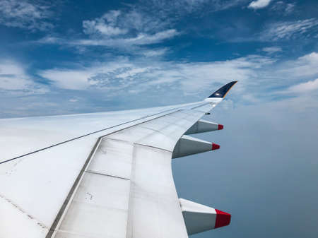 BARCELONA, SPAIN - AUGUST 20, 2016: Wing of a passenger plane, blue sky and clouds. Copy space. Space for text