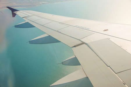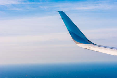 Aerial view of ocean through a plane window. Wing of an airplane with blue sky and beauty clouds. Traveling by air.