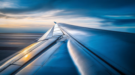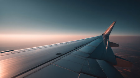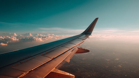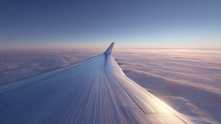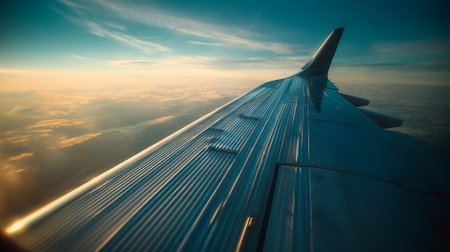 Soar through a dreamlike dawn with this breathtaking aerial view. An airplane wing gracefully pierces through vibrant clouds, painted with a pastel gradient of blue and orange hues from the sunrise. Capture the spirit of travel and adventure with this scenic landscape photo, perfect for illustrating aviation, travel industry content, or inspiring vacation campaigns. This ethereal image evokes feelings of freedom, tranquility, and the promise of a new journey from the horizon.