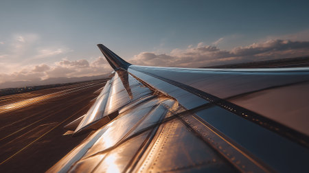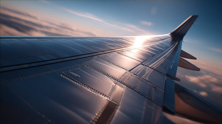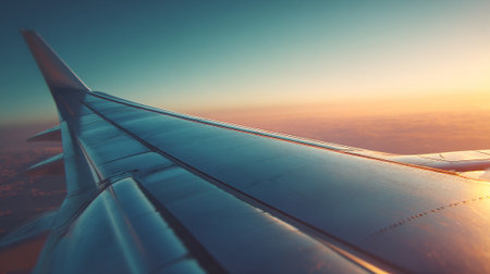 Airplane wing soaring through the sky during a breathtaking sunset flight