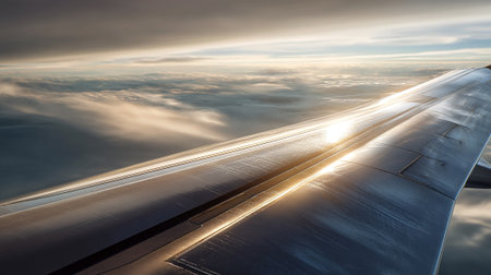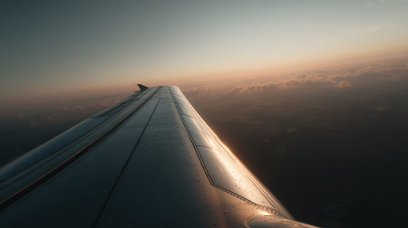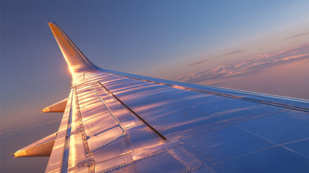 Airplane wing soaring through a serene sunset sky with warm golden light