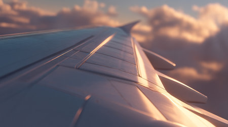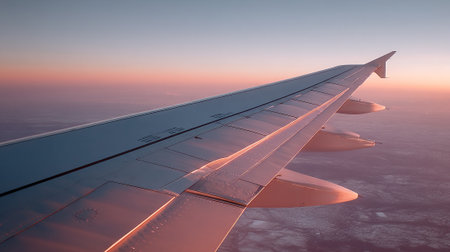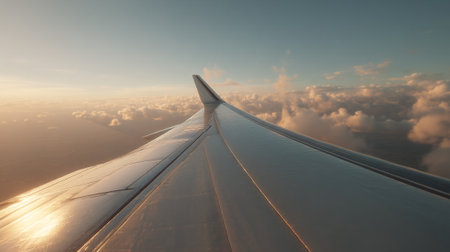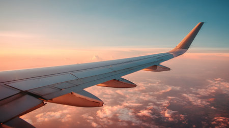 A stunning view from an airplane window during golden hour, showcasing a wing above a dreamy cloudscape. The soft sky gradient creates a cinematic and tranquil travel mood.