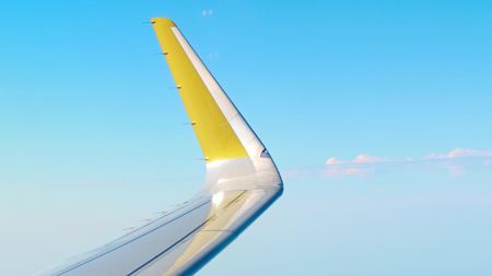 View from airplane on the aircraft white wing flying over cloudy landscape in sunny morning. Air travel and transportation concept.