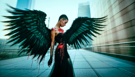 A male Black Angel stands at sunset in front of an old concrete building. Place for text. The concept of war, doomsday, Apocalypse.