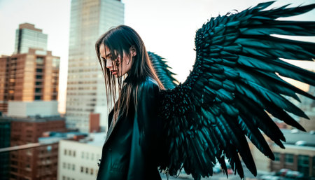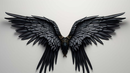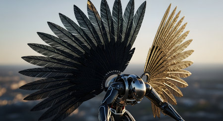 A futuristic robot with a sleek, chrome body stands with large, black, feathered wings spread out like a dark angel. The fusion of advanced robotics and classic angelic imagery creates a powerful and dramatic science fiction or fantasy concept.