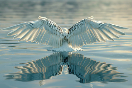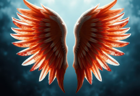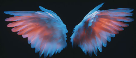 Pair of delicate, beautifully colored wings extends outward, with intricate details of feathers caught in a serene, diffused light. created with generative AI technology