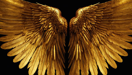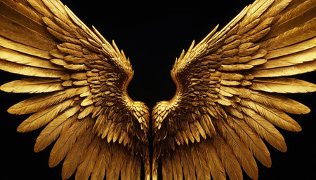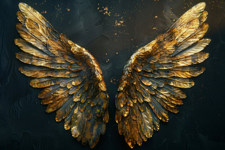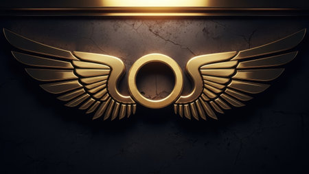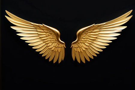 The image features a pair of golden wings with a circular symbol in the center. The wings are intricately designed with detailed feathers and are set against a dark background. The circular symbol in the middle adds a sense of completeness and balance to the overall composition.